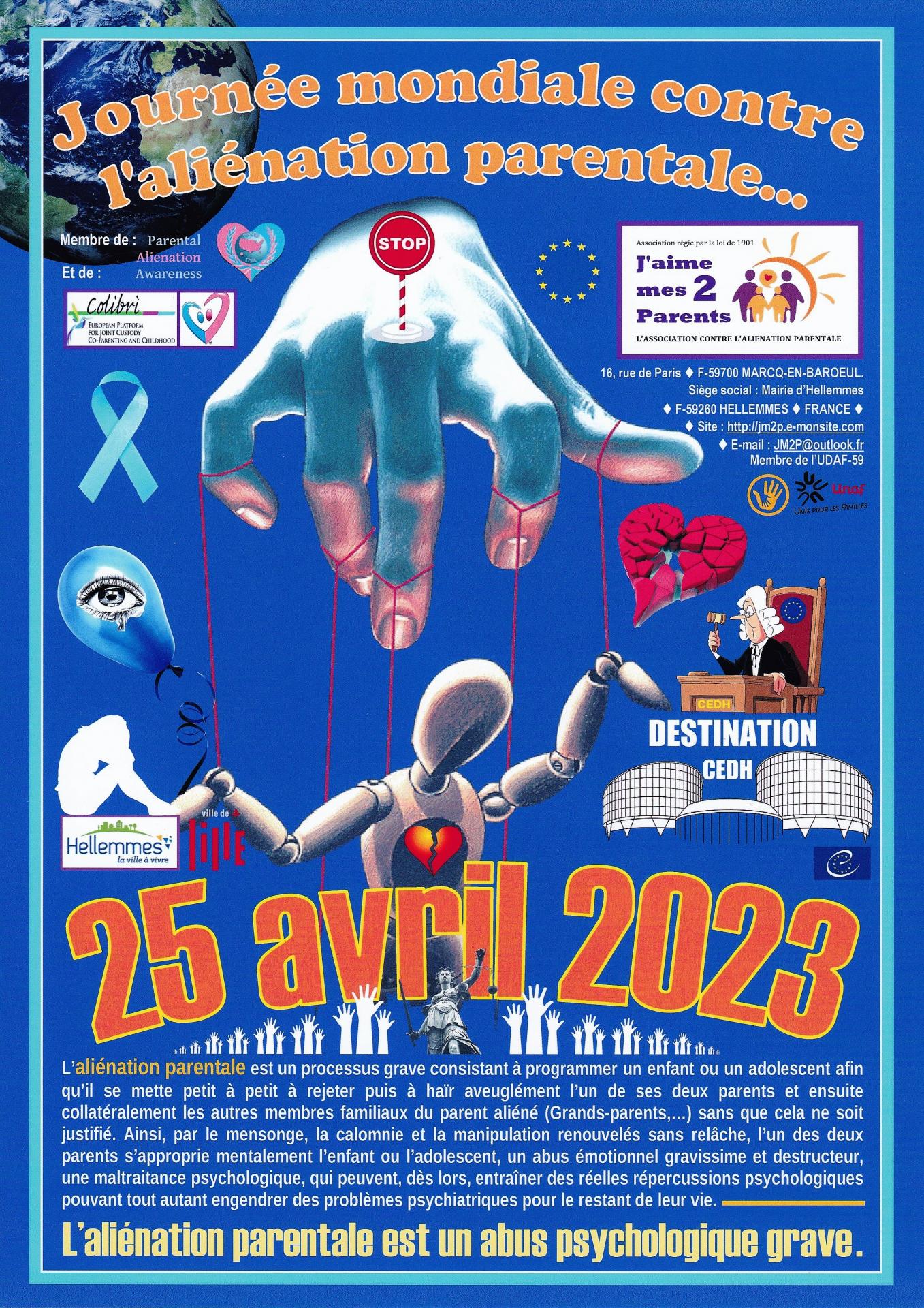 Le 25 AVRIL : De nombreux pays à travers le monde s’engagent pour cette journée internationale contre l’exclusion parentale, contre les violences psychologiques qu’implique l’aliénation parentale, pour le maintien des liens parentaux avec l’enfant.