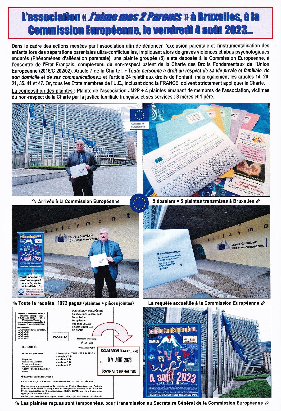 Le vendredi 3 novembre 2023, l'association reçoit les résultats des recherches mises en place pour pouvoir poursuivre les plaintes introduites auprès de la Commission Européenne située à Bruxelles, suite au dépôt initial du 4 août 2023 et à l’entretien avec la Commission le 10 octobre dernier, à l'encontre de l'Etat Français et tout spécialement de sa justice familiale, pour multiples violations et manquements flagrants de la Charte des Droits Fondamentaux de l’Union Européenne et tout particulièrement vis-à-vis des articles 7, 14, 20, 21, 24, 35, 41 et 47 de celle-ci.